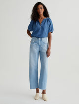 A cropped version of our Hattie barrel jeans. The Hattie Crop has an ultra-high waist and a curved shape at the legs, complete with side-seam paneling and raw hems that land above the ankle. Crafted from 13 oz. Sioux Rigid Denim, this pair features 100% cotton construction in a light blue wash with faded details and touches of distressing at the front pockets.