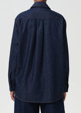 The Kaelin Shirt is cut from clean rinsed indigo denim and designed with a subtle wrap-front effect that can be worn multiple ways. Lightweight yet structured, the button closure allows for styling versatility—wear it open and oversized or crossed and tucked.