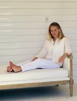 Introducing the Jackie Cardigan - This new spring classic is effortlessly chic! While the name evokes an elegance and sophistication of the garden parties of yesteryear, this cardigan ushers in a modern touch with two rows of fringe on the collar and down the front plackets. One button closure at the neck. Sits at the waist.