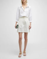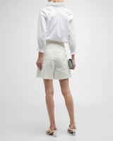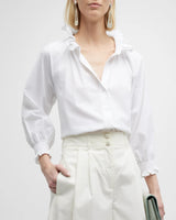 Ruched white poplin shirt with a ruffle neckline and 3/4 blouson sleeves