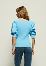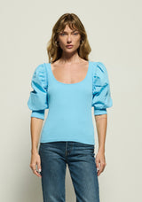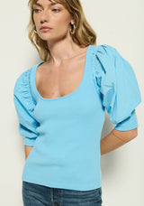 Designed with confidence in mind, the Corynn top features a fitted ribbed cotton silhouette with poplin puff sleeves that fit at the elbows, and a polished scoop neckline. This one comes in Day Dream.