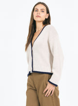 The Mallory Cardigan is a modern twist on a classic layer, knit from a soft, breathable blend of cotton, nylon, and silk. Featuring a deep V-neckline, and navy tipped trims, this relaxed fit silhouette adds a polished edge to everyday comfort. Effortlessly versatile, wear it buttoned up or layered open.