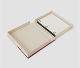 Material: Cover: 100% Cotton fabric + recycled greyboard. Pages FSC, acid free white card. Black metal binder.