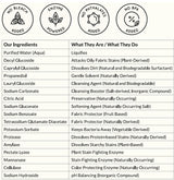 Filtered Water (Aqua), Decyl Glucoside, Caprylyl Glucoside, Propanediol, Lauryl Glucoside, Sodium Carbonate, Citric Acid, Sodium Gluconate, Sodium Benzoate, Tetrasodium Glutamate Diacetate.