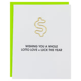 Our "Lotto Love + Luck" card is letterpress printed on a vintage printing press in sunny California. Card includes a heavy duty gold dollar sign paper clip.
