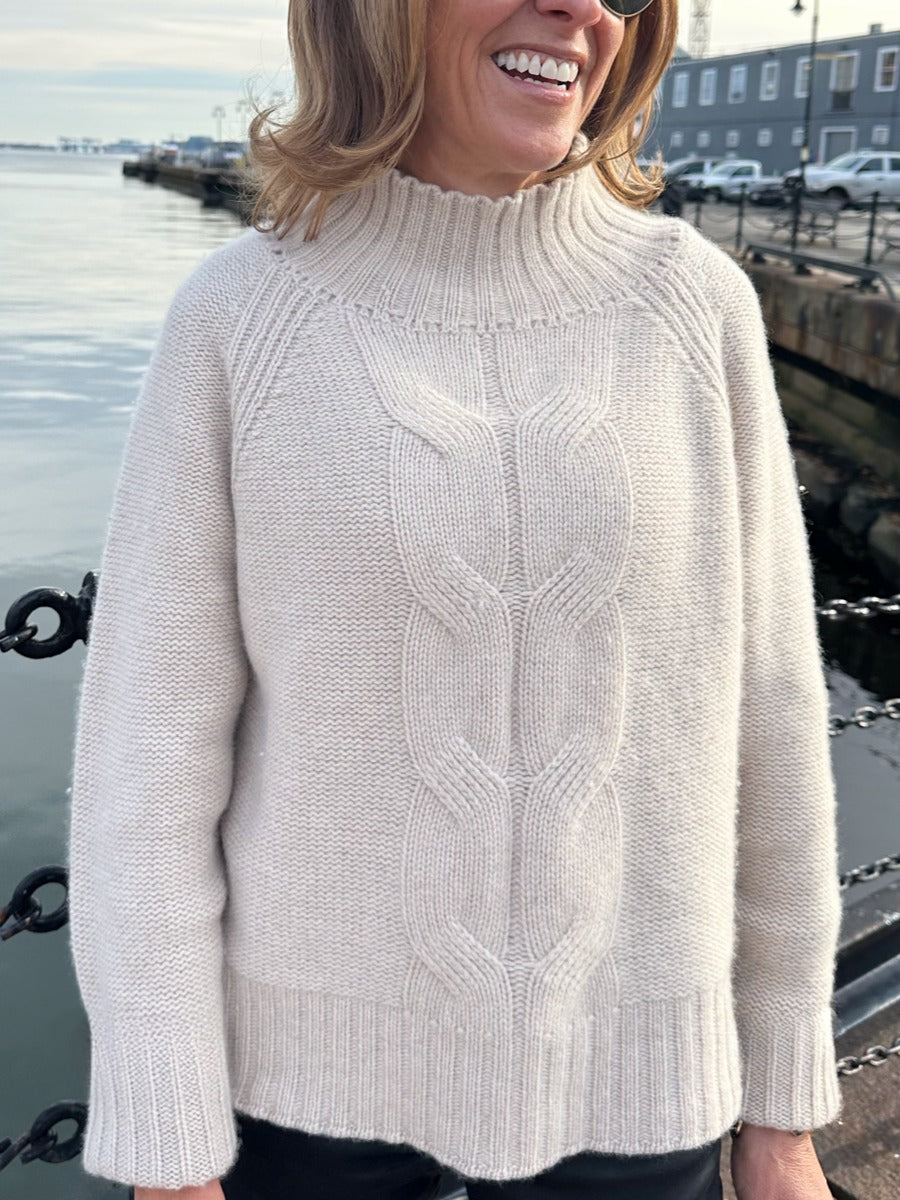 100% Heavy weight cashmere sweater with mock neck and cable link design in center