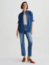 Brinley is our mid-rise straight fit for women. These five-pocket jeans sit right at the natural waist and fall to a classic straight-leg silhouette. Designed in 11.75 oz. Vintage Comfort Stretch Denim from Italy, this pair offers a timeless medium blue wash with fading, whiskering, and worn edges.