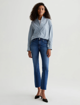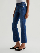 The Farrah Boot Crop features a high-rise bootcut silhouette with raw hems in a cropped length. This five-pocket pair has a medium-indigo wash that's been faded and whiskered for a naturally lived-in character. Crafted from 10 oz. superstretch Empower Denim from Japan, these women’s bootcut jeans sit high on the waist and have a skinny fit through the legs before opening into a subtle flare.