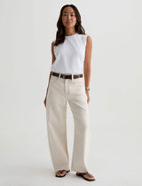 The Hattie Crop is a high-rise barrel jean with a 26.5” inseam, crafted from 11.75 oz. Soft Pure Denim in a clean white wash. Made from non-stretch denim and finished with a raw hem, it offers a structured feel with a modern edge.