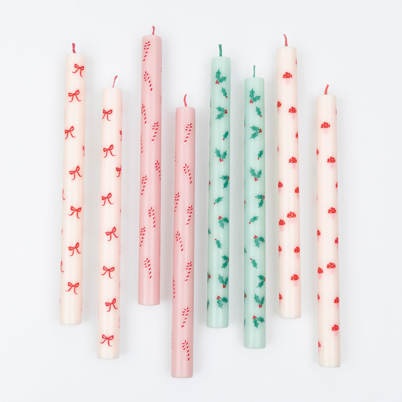 It's holiday candle time! Enhance your seasonal decor with this stylish set of eight festive table candles, featuring a mix of timeless yet contemporary patterns and colors. The striking red and green wicks add a special touch, to create a warm, inviting glow. Perfect for your dinner table or mantel as a statement centerpiece, or display throughout your home. Beautifully packaged in a printed patterned keepsake box, they also make an elegant host gift or thoughtful present for someone who adores eye-catching candles.