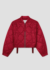 Looks Like: Bright medium red cropped quilted jacket with zipper front closure