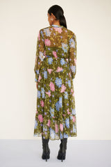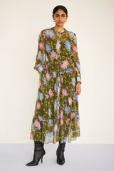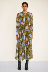 Evoking the magic of the Uzbek Silk Road, the Emira dress is a showpiece full of soul. Crafted from crinkle chiffon, its sheer sleeves, drapey skirt, and delicate ruffles create enchanting movement, with fabric-covered buttons, elevated eyelash details, and a detachable belt. The Dahlia print — a painterly floral inspired by blooming Uzbek gardens — adds enduring allure. Finished with side-seam pockets. Slip included.