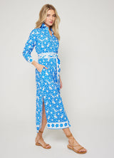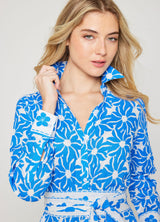 Made for your 9-5 or 5-9. Our signature Peyton shirtdress style gets a vibrant upgrade in this season's Vaeda print in 100% cotton. A self-tie belt can be worn on or off depending on your mood. This contemporary all over floral print is in crisp royal blue and white with a contrast border to add a bit of pop to the hem and tie sash.