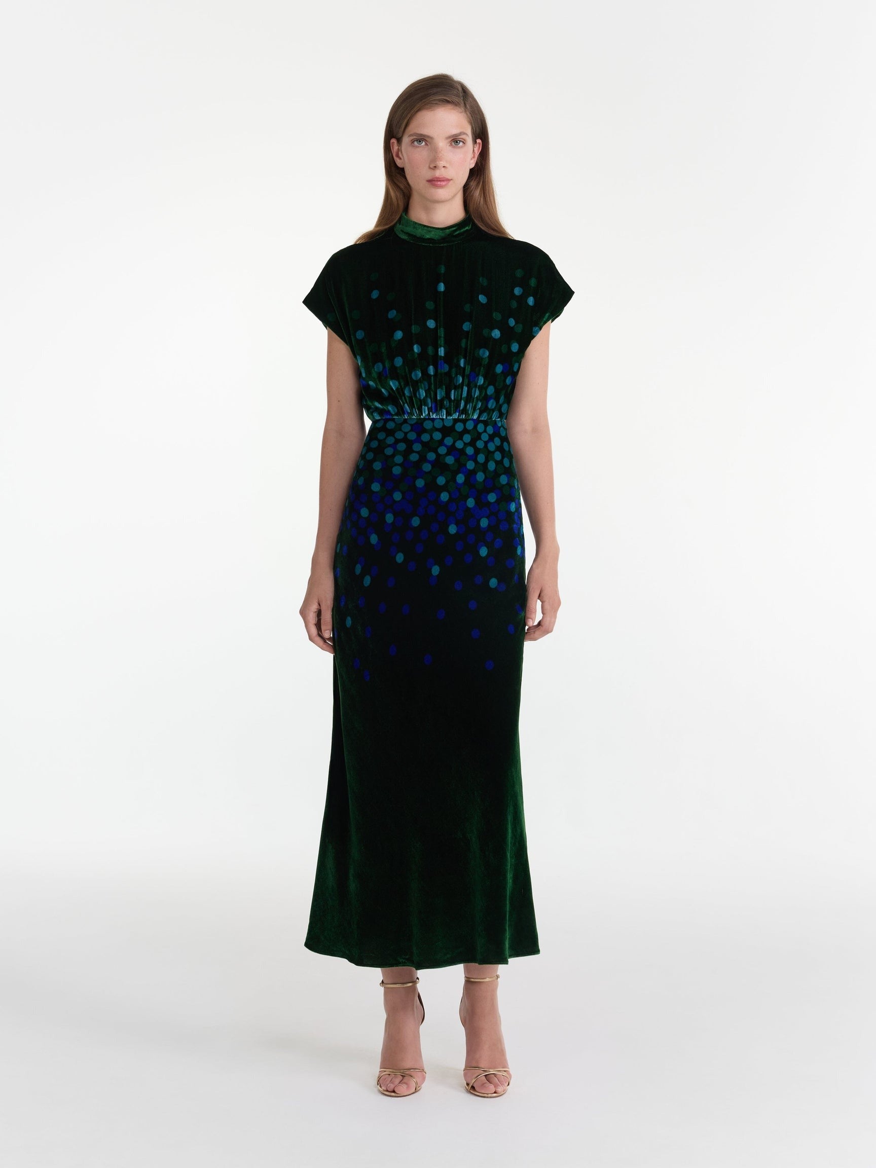The Fabienne-B Dress in Starlight Sky Placement is an elegant addition to the season’s collection, featuring a high-collared neckline and a cap-sleeve draped bodice. This velvet midi dress is adorned with cool-toned polka dots on a rich emerald base. With its timeless sophistication and subtly elevated details, this dress is a wardrobe hero, designed to be worn on repeat.