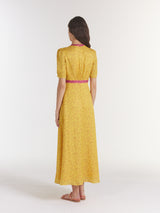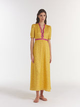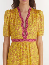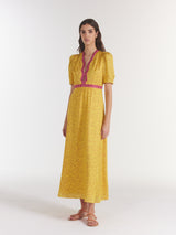 The Tabitha Dress in Ambra Sunrise features a scattering of ditsy leaves across a vibrant sunrise yellow ground, complemented by a contrasting border trim. Updated for the spring season, this dress boasts a flattering silhouette with a fitted waist and a fit-and-flare skirt. It has beautiful, embroidered detailing on the centre front. Pair it with minimal accessories and heels for a timeless look.