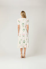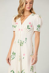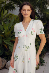 Beautiful embellished linen midi dress. This style features a v-neckline with a front button placket, a fitted bodice with an empire waist, short puff sleeves with pleated detail on the sides, and an A-line midi skirt. Fully lined. Buttonfront.