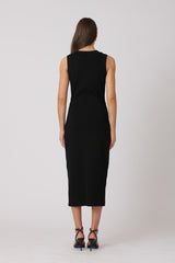 Sleek and fitted knit dress, with a slightly flared skirt. It features a crew neckline with a cut-out detail on the front shoulder. The elegant gold hardware details accentuate the waist. Unlined.