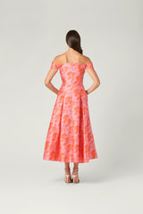 Stunning cocktail dress in a floral jacquard. This style features an off-shoulder neckline with beautifully draped sleeves. The front bodice also has a delicate drape detail. This full-volume, A-line skirt has box pleats. Full bustier construction inside. The bodice is lined, skirt is unlined. Hidden back zipper.