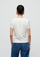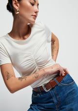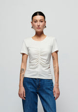 The classic crewneck tee you live in looks a little more chic now. Might be that effortlessly feminine front shirring. If we had to guess.