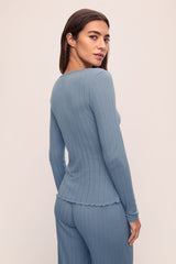 Pointelle V Neck Henley - Faded Denim