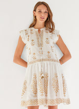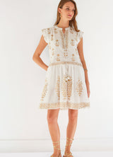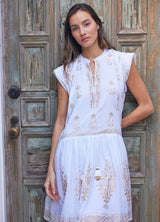Flirty and flouncy. The easy silhouette of the Bettina Drop Waist dress features feminine cap sleeves punctuated with a split-stand collar at the neckline adorned with a tassel tie. Beautiful gold hand block printing and embroidery adorn this dress of 100% cotton. The easy drop waist style and added pockets make the Bettina Drop Waist dress a must in your wardrobe. This dress is completely lined.