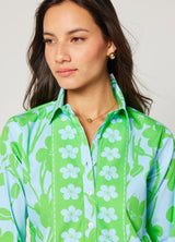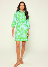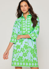 Our favorite Charlie Shirtdress is available in our new exclusive Petal print featuring grass green flowers silhouetted on a sky blue background. The floral border adds a fun detail to the neckline, sleeves and hem. Cut from stretch cotton, this style is as versatile as it is chic. The 3/4 sleeves, button front and hem just above the knees is the perfect style to pack for a vacation or wear for a girls night out. Pair the Charlie with sneakers or sandals and your favorite sunhat.