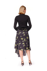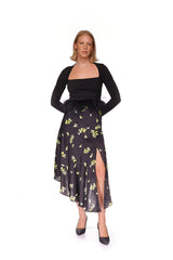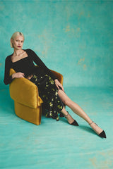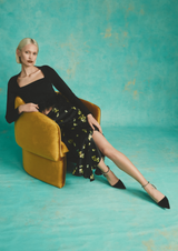 This long-sleeved luxe compression knit features a flattering square neckline and festive Ostrich feather trim.