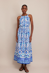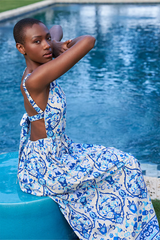Decorated in a geometric print, the Colomba Dress features a high scoop neckline and elastic waistband. The open back is detailed with adjustable bow ties and fully elasticated shoulder straps and waistband. Timeless yet flirty with a flattering fit and silhouette that is both elegant and functional, the Colomba is a go-to for summer soirees and coastal or country vacations.