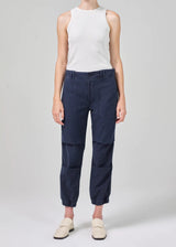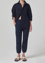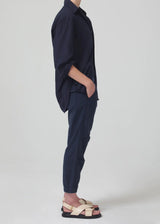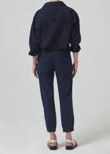 An off-duty essential. The Agni Trouser is designed with a utility inspired fold details through the leg. This mid rise fit offers a relaxed feel and tapers to an elasticated cuff.