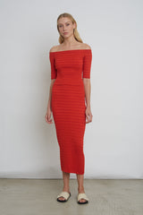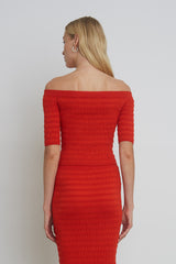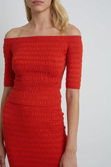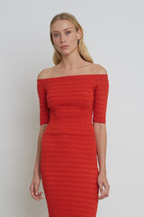 Helene is an off shoulder day to night, cropped sweater-top. This piece has a feminine seersucker, texture-stitch in a must-have tomato color and a hidden elasticated off-shoulder neck to keep secure and comfortably in place.