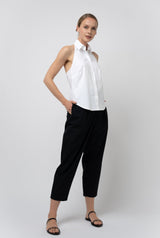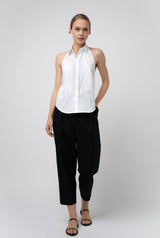 Introducing our new button-up halter top. This top is slightly shaped through the waist, with a high rise under the arm for more front coverage. This shirt has the classic GRAMMAR collar you love with signature mitered collar stand. Offered in our signature cotton poplin, this fun take on a the classic button down will be the perfect summer addition to your wardrobe. Pair it with your favorite jeans or skirt for a chic look that will turn heads.
