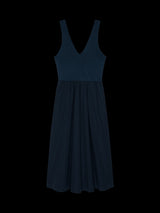 With a v-neckline, fitted bodice, contrast skirt, and side seam pockets, this one keeps it simple while still delivering that cool girl je ne sais quoi. This one comes in Night Sky.