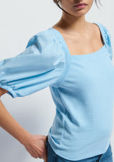 This square-necked puff sleeve blouse is the perfect blend of simple and chic. Featuring contrast cotton poplin sleeves and a ribbed neckline, it's the throw-on-and-go top you need. (This one comes in Powder Blue.)