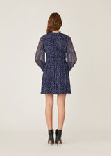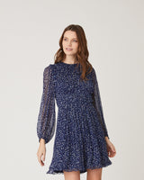Pretty crinkle chiffon mini dress in a tonal leopard print. This style features a round neckline, fitted bodice with gathering details along the neck and waist, full length balloon sleeves with elastic at the openings, and a flowy mini skirt with a small ruffle at the hem. Body is lined, sleeves unlined. Hidden back zipper.