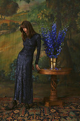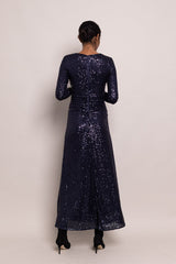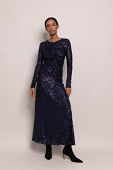 The Maisy Dress emulates chic freshness. Rendered in poly mesh and sequins, this flattering A-line midi’s ruched bodice and lean sleeves versatility for every occasion.