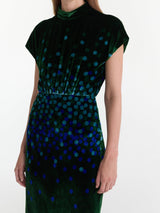 The Fabienne-B Dress in Starlight Sky Placement is an elegant addition to the season’s collection, featuring a high-collared neckline and a cap-sleeve draped bodice. This velvet midi dress is adorned with cool-toned polka dots on a rich emerald base. With its timeless sophistication and subtly elevated details, this dress is a wardrobe hero, designed to be worn on repeat.
