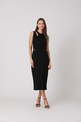 Sleek and fitted knit dress, with a slightly flared skirt. It features a crew neckline with a cut-out detail on the front shoulder. The elegant gold hardware details accentuate the waist. Unlined.