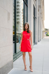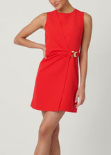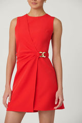 Stunning red crepe sleeveless mini dress. This style features a round neckline, fitted bodice with an overlapping drape detail that cinches at the side waist with a gold chain trim, and an A-line mini skirt. Bodice lined. Skirt unlined. Hidden back zipper.