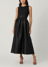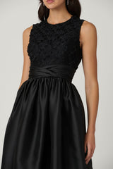 Beautiful, mixed media cocktail dress. Round neckline and clean, sleeveless bodice in textured mesh lace. Beautifully draped waistband and full-volume skirt in luxurious Mikado fabric. Fully lined. Hidden back zipper.