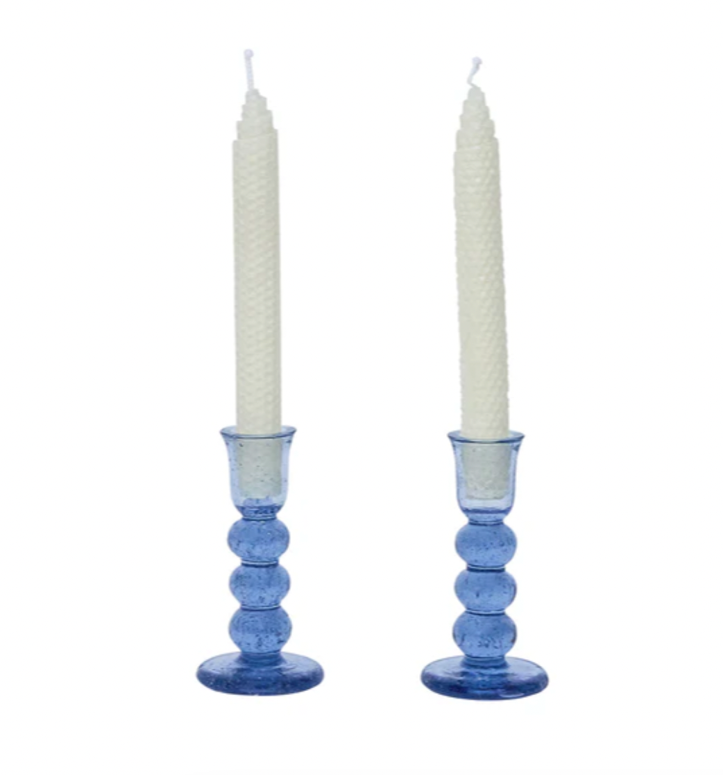 Add a touch of whimsy and romance to the table with these sculptural mouth-blown glass candlesticks in vibrant and joyful hues. Inspired by the traditional bubbly glassware from Provence in southern France, this perpetually effervescent set brings sparkle and luminescence to everyday occasions and special celebrations alike.