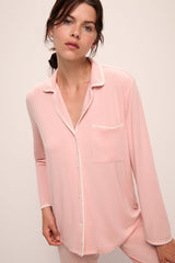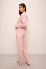 For the one who appreciates the details. Made from TENCEL™ Modal fibers and a touch of spandex, this buttery soft fabric is verified by OEKO-TEX® Standard 100, meaning it’s dyed with safe and non-toxic dyes. This artisanal whipstitched set features a relaxed long sleeve button front top with a notch collar and functional pocket while the low-rise straight leg pant features a thin elastic waistband.