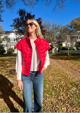 Experience luxury and style with our Greenwich Gold Vest. Its down filling provides warmth, while the cap sleeves add a touch of fun. Adorned with exquisite gold buttons, this vest is the perfect statement piece for any occasion. Elevate your wardrobe with this exclusive and elegant addition