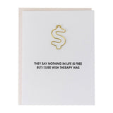 Our "Nothing In Life Is Free, Wish Therapy Was" card is letterpress printed on a vintage printing press in sunny California. Card includes a heavy duty dollar sign paper clip.