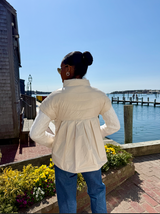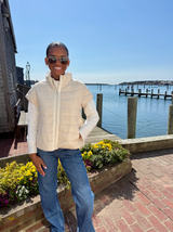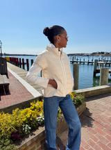 Our best selling Palm Beach Puffer's new sister, The Royal Palm: Same attention to detail with a beautiful flounced back. This one-of-a-kind jacket boasts luxurious down filling, chic cap sleeves, and a sophisticated grosgrain zipper detail. Experience both warmth and style in any season!