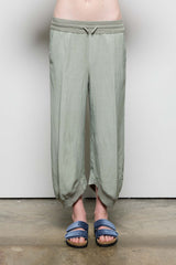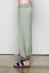 Jogging pants with ribbed waist and drawstring at the front. Back part of the belt with classic triangular detail. Ribbed hem. Pockets inserted into the sides and single welt pockets at the back. Made of a viscose linen blend fabric, this garment is a perfect passepartout for any occasion.