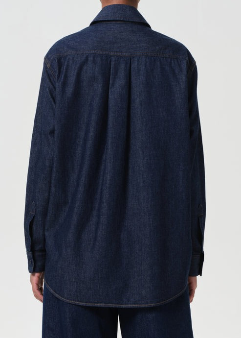 Looks Like: Clean rinsed dark indigo denim shirt with versatile button closure