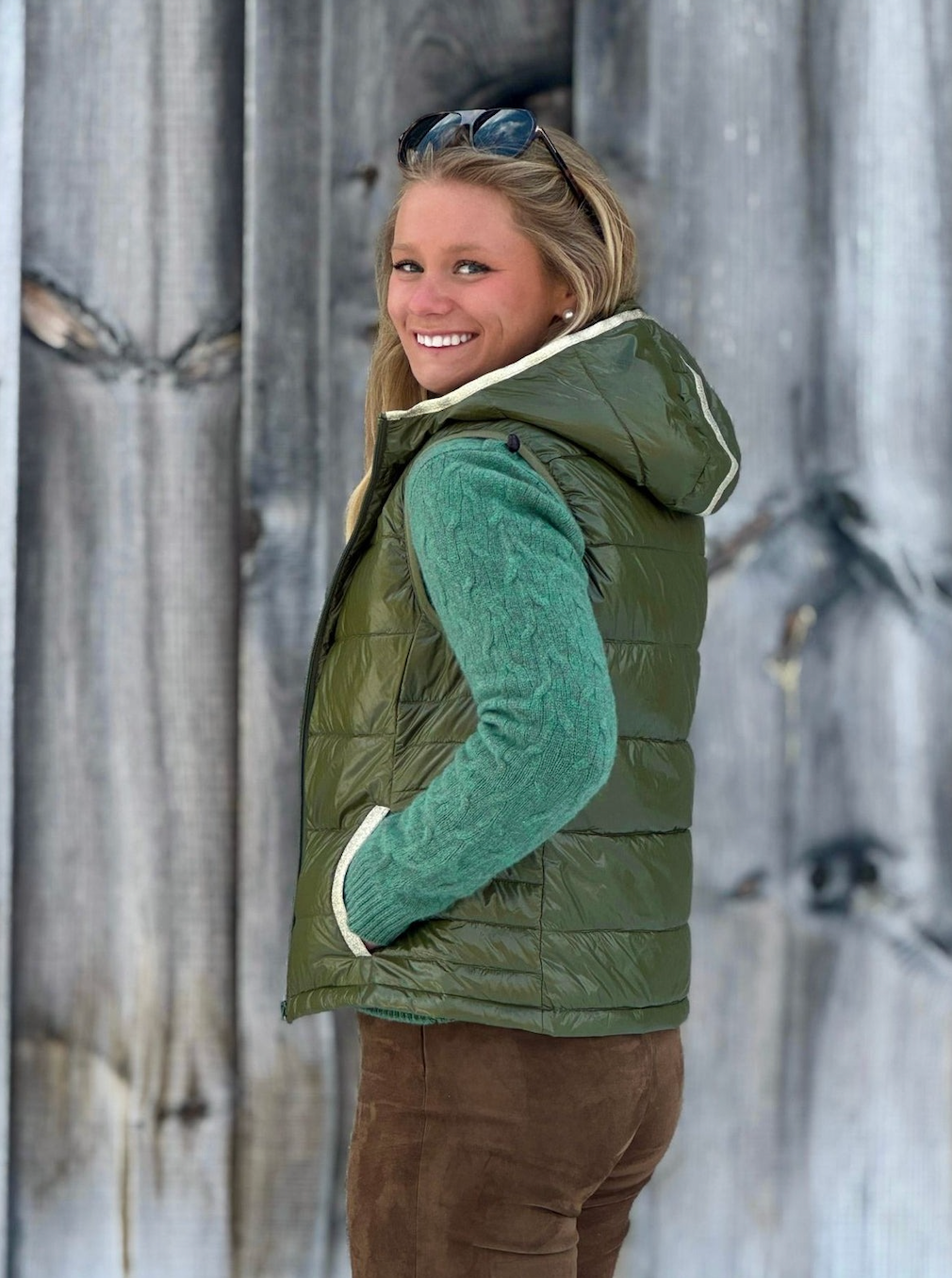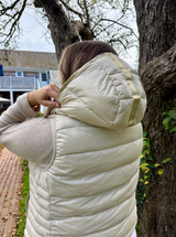 Introducing the Vespa Gold - Our popular down vest with hood and gold trim.