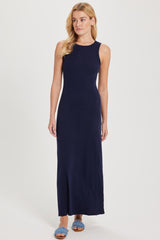 Head turner: a full-length, sleeveless dress with a luxurious rib knit that hugs your body like a glove. This style has a crew neckline and subtle cutaway shoulders.