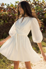 Pretty, white burnout stripe, jacquard mini dress. This style features a round neckline with a front keyhole opening with a hook and eye, ¾ length balloon sleeves with encased elastic a the openings, a fitted bodice with draped ruching details and a front bow tie at the waist, and a full A-line mini skirt.  Bodice and skirt lined, bodice yokes and sleeves unlined. Hidden back zipper.