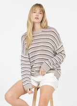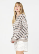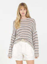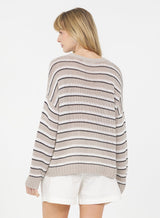 Crafted from a lightweight blend of 36% linen, 44% cotton, and 20% polyester, this pullover offers a perfect balance of softness, durability, and natural texture. The relaxed silhouette and classic crew neckline make it ideal for layering or wearing solo, while the bold stripes bring a fresh, laid-back vibe.